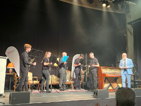 Moderiert wurde die Eröffnung durch Stefan Meyer (rechts). Umrahmt von verschiedenen Formationen der Jugendmusikschule Gelterkinden.