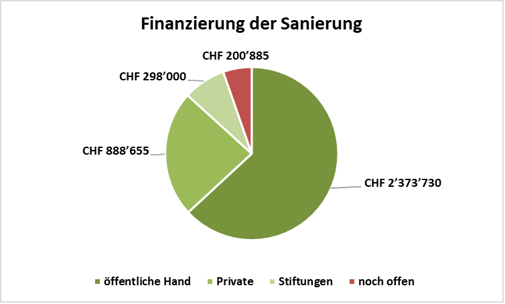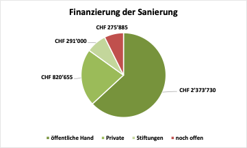 Auf Grund der vergebenen Arbeiten und der Kostenschätzungen für die noch offenen Posten ergibt sich aktuell ein Baubudget von rund 3.4 Mio. Franken. Wenn es gelingt, die Finanzierung für die zurückgestellten Arbeiten auch noch sicher zustellen werden voraussichtlich 3.8 Mio. Franken investiert.