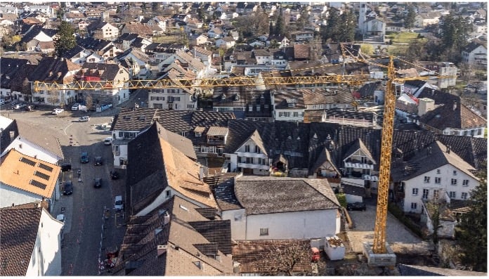 Rechts: Der lange Ausleger des Krans erlaubt es, Material von der Anlieferung in der Schulgasse über die Häuser zur Baustelle im Hinterhof zu heben.