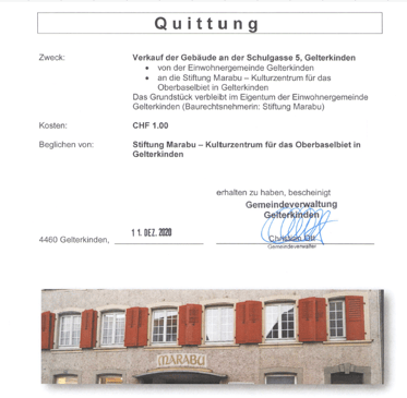 Am 11. Dezember hat die Stiftung Marabu den Kaufpreis von einem Franken auf der Gemeindeverwaltung beglichen. Damit ist die Übergabe der Liegenschaft an die Stiftung auch finanziell abgeschlossen.